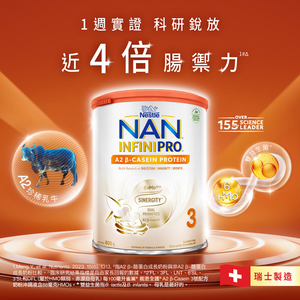 全新雀巢®能恩全護® INFINIPRO® A2 β-Casein珍稀面世, 匯聚百年科研智慧,研發自雀巢®瑞士研究中心。經嚴格的DNA基因檢測,精準鎖定僅有30%的珍稀A2乳牛1。配合革命性「協同昇華技術◇」,雙益生菌▲x 6HMOs^,成就全港獨有的A2 β-Casein珍乳組合*,更貼近母源營養**,易於消化吸收,銳放寶寶頂尖腸禦力,延續母源守護。